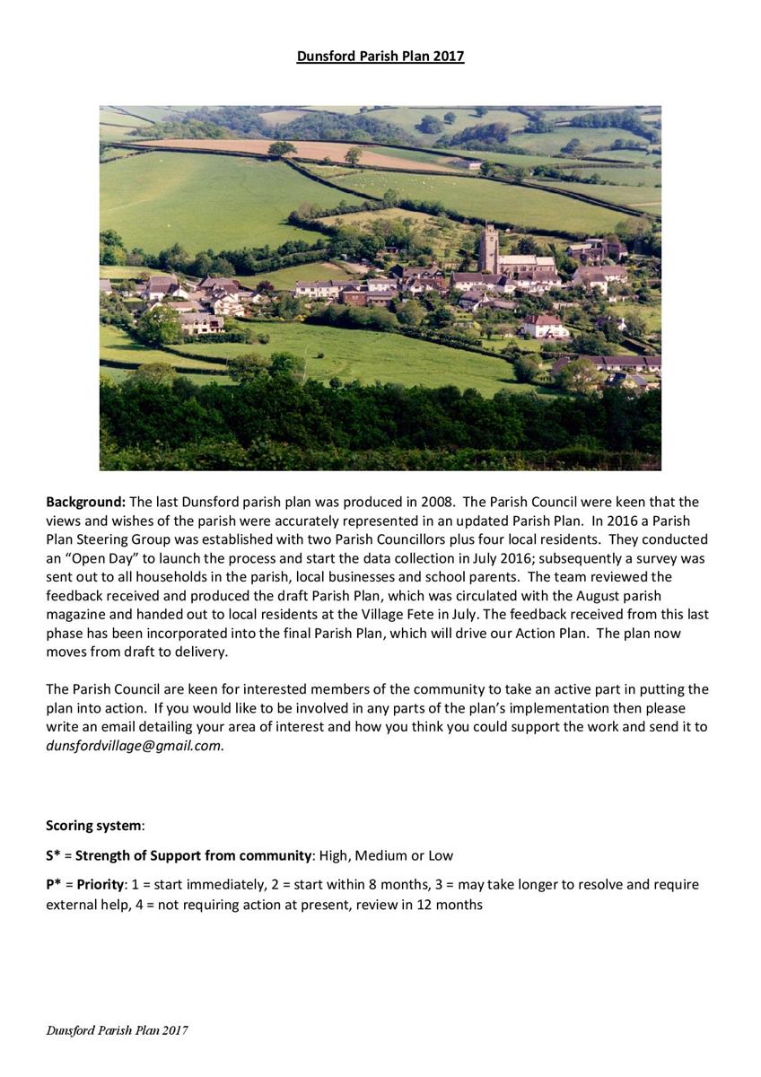 The current Dunsford Parish Plan was developed in 2017. It is available to read below and to download here: Dunsford Parish Plan 2017